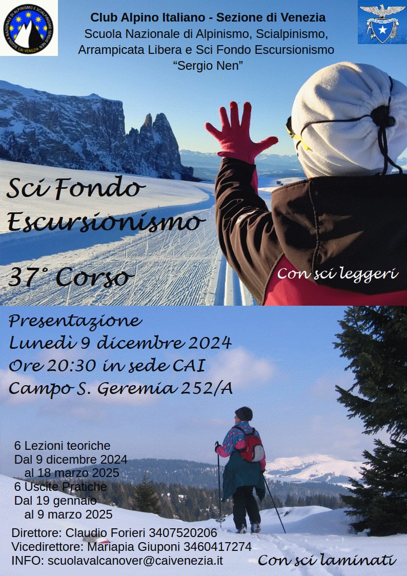 Attraverso lezioni teoriche e pratiche su terreno innevato si forniranno le nozioni fondamentali per poter svolgere con ragionevole sicurezza l’attività di sci di fondo escursionismo oppure l’attività di sciescursionismo. I percorsi si svolgono lungo itinerari di bassa difficoltà, privi di dislivello significativo e aventi lunghezza contenuta, sia su pista battuta per apprendere le tecniche di base, sia fuori pista lungo strade forestali, mulattiere, boschi e pascoli alpini. Verrà trattato l’argomento dei pericoli oggettivi della montagna invernale.