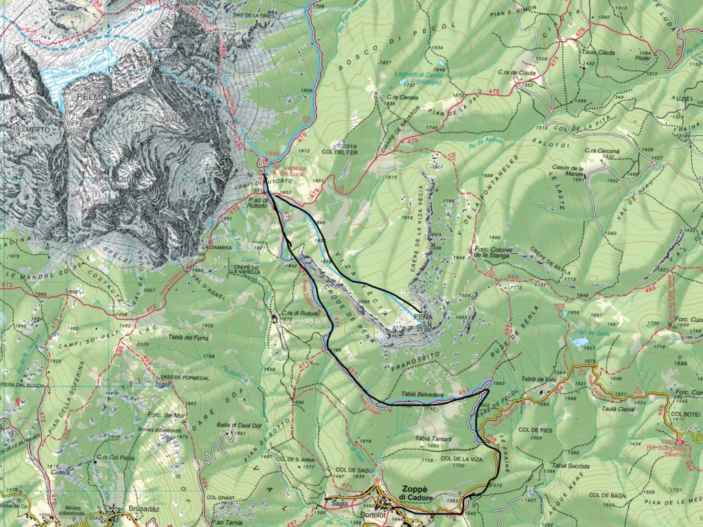 Dal centro del paese d Zoppe’ di Cadore ,prendiamo la strada asfaltata che con moderata pendenza sale a est verso il Col de Pian. Ora l’asfalto termina e la strada si inoltra nel bosco. A quota 1600 ad un bivio proseguiamo sulla strada principale verso nord. In corrispondenza di uno stretto tornante abbandoniamo la strada bianca e prendiamo il sentiero Cai 493. Il sentiero sale